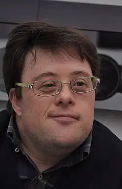 This is a list of people with Down syndrome, a condition also known as Down's syndrome or trisomy 21. Down syndrome is a genetic disorder caused by the presence of all or part of a third copy of chromosome 21.[1] It is typically associated with developmental delays, characteristic physical features, and mild to moderate intellectual disability.[2] The average IQ of a young adult with Down syndrome is 50, equivalent to the mental age of an 8- or 9-year-old child, but this number varies widely.[3] At the same time, they enjoy a rich social and emotional awareness.[4] Down syndrome is the most common chromosome abnormality in humans,[3] occurring in about one per 1000 babies born each year.[2]