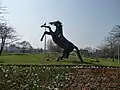 1986 | Simon Evans | Prancing horse sculpture | scrap metal, coated black | h 365cm | Coventry City Council | Formerly on Ring Road. Re-sited on Greyfriars Green 7 Feb 2018.[7] Was removed in 2014 and restored by the sculptor Andy Langley, before being resited here.[8]
