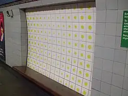 Spot motif | Pimlico tube station platforms | c. 1972 | Peter Sedgley | — | Tiled pattern | — | The motif of yellow spray bursts on a white background was inspired by Sedgley's own op art painting of 1968, Go.[5] |