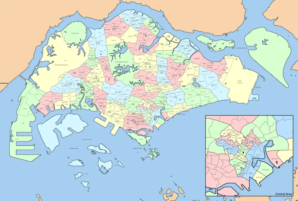 Singapore is a city-state island nation in Southeast Asia. For urban development, Singapore is divided by the country's Urban Redevelopment Authority (URA) into 5 regions, which are subdivided into 55 planning areas, and further subdivided to a total of 332 subzones.[1]