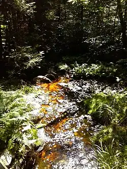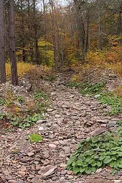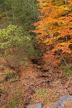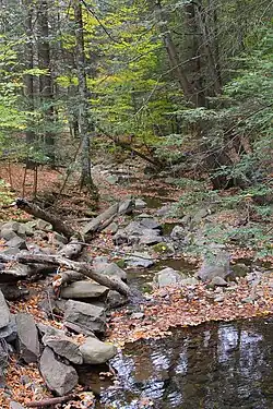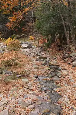 Bowman Creek's main stem is designated as a High-Quality Coldwater Fishery and the watersheds of all but two of its tributaries have the same designation.[4] The watersheds of the remaining two tributaries, Sorber Run and Cider Run, are designated as Exceptional Value waters, with standards even higher than those of High-Quality Coldwater Fisheries.[4][5] Additionally, these two tributaries are the only Wilderness Trout Streams in Wyoming County.[6] Wild trout naturally reproduce throughout all of the creek's tributaries.[7] A total of ten named streams in the watershed of Bowman Creek are classified by the Pennsylvania Fish and Boat Commission as Class A Wild Trout Waters.[8] Most hold this designation for brook trout only, but Sugar Hollow Creek and a section of Roaring Run hold the designation for rainbow trout, either instead of or in addition to brook trout.[8]