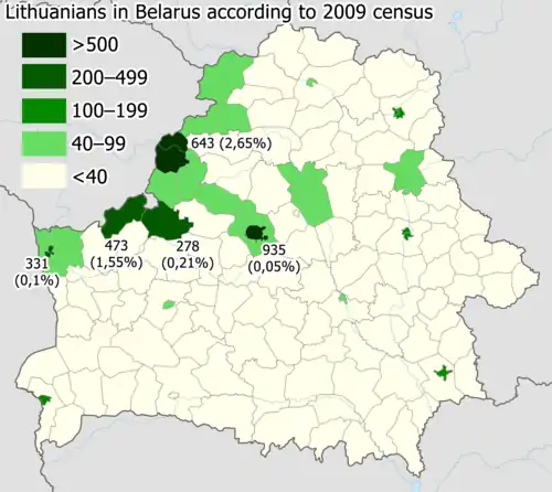 According to the 2009 census in Belarus, there were 19,091 ethnic Lithuanians in Belarus.[1] Lithuanians are most significantly concentrated in Grodno and western Vitebsk regions, which border Lithuania, but concentrations of Lithuanians can also be found in Belarus' eastern regions.