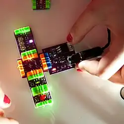 littleBits is a New York City-based startup that makes an open source library of modular electronics (open-source electronics), which snap together with small magnets for prototyping and learning.[1][2] The company's goal is to democratize hardware the way software and printing have been democratized.[3] The littleBits mission is to "put the power of electronics in the hands of everyone, and to break down complex technologies so that anyone can build, prototype, and invent."[4] littleBits units are available in more than 70 countries and used in more than 2,000 schools.[5] The company was named to CNN's 10 Startups to Watch for 2013.[6]