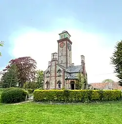 Located to the northwest of the church is Little Ellingham hall and its associated clock tower, both built in 1855. The brick tower, which stands at the centre of a group of cottages, is three stories high with a cupola on the top.[6]