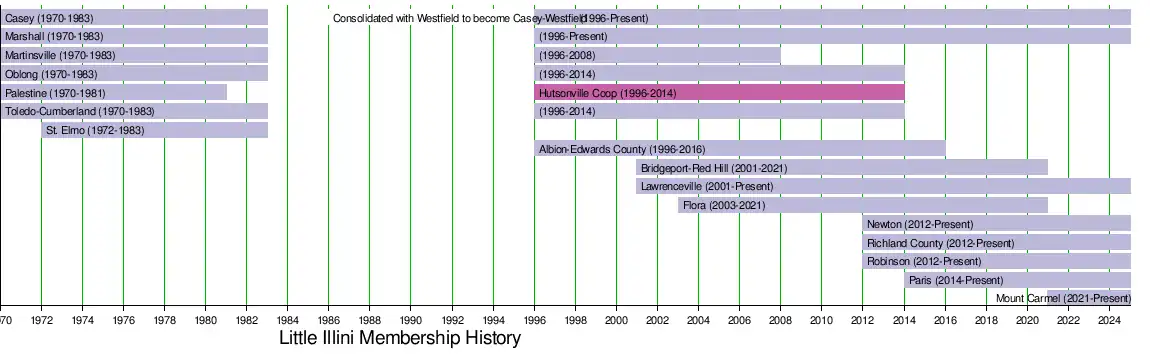 In 2014 several schools, including Cumberland, Palestine-Hutsonville and Oblong left the Little Illini Conference to join the Little Okaw Valley Conference in central Illinois while Paris High School joined the conference. This followed the addition of Newton, Olney and Robinson high schools, which had been longtime members of the Apollo Conference.