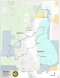 Very strong winds originally caused the prescribed burn to escape the fire perimeter, after embers were blown out.[1] Around midnight October 14, shortly before the fire started, a wind gust was reported at 87 miles per hour (140 km/h). Shortly after the fire started, sustained winds blew 16–18 miles per hour (26–29 km/h), with gusts up to 55 miles per hour (89 km/h).[2] The area was suffering from long-term drought.[3]
