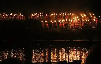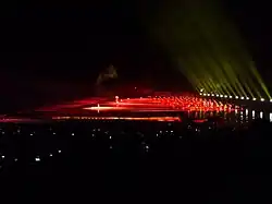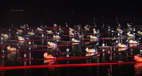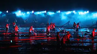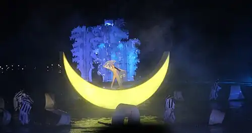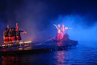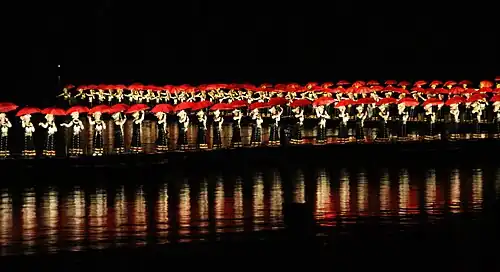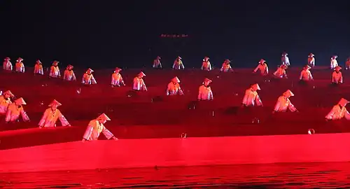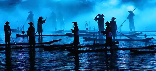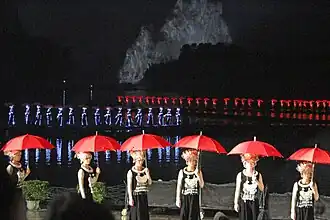 Impression Liu Sanjie was staged on March 20, 2004 by director Zhang Yimou in Yangshuo with more than 600 participants and is a local tourist attraction. That is the world's biggest natural auditorium that uses Li River waters as its stage, with its backdrop to be twelve mist-enveloped hills. Impression Liu Sanjie is divided into seven scenes.[17] The light show lasts 70-minute on a nature stage along with the Li River, performers wear traditional attire from the Zhuang, Miao, and Yao minorities, which showcasing numerous light-emitting diodes.