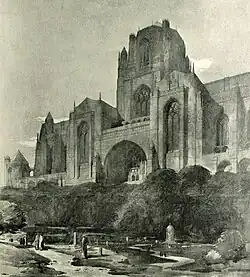 Architects were invited by public advertisement to submit portfolios of their work for consideration by Bodley and Shaw. From these, the two assessors selected a first shortlist of architects to be invited to prepare drawings for the new building. It was stipulated that the designs were to be in the Gothic style.[16] Robert Gladstone, a member of the committee to which the assessors were to report said, "There could be no question that Gothic architecture produced a more devotional effect upon the mind than any other which human skill had invented."[17] This condition caused controversy. Reginald Blomfield and others protested at the insistence on a Gothic style, a "worn-out flirtation in antiquarianism, now relegated to the limbo of art delusions."[18] An editorial in The Times observed, "To impose a preliminary restriction is unwise and impolitic … the committee must not hamper itself at starting with a condition which is certain to exclude many of the best men."[19] Eventually it was agreed that the assessors would also consider "designs of a Renaissance or Classical character".[20]
