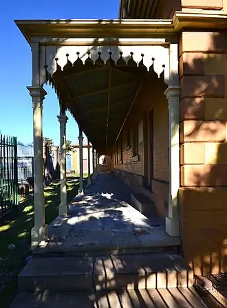 A single-storey Colonial Georgian style government building with hipped roof, with L-shaped plan, probably incorporating main block of convict gaol built early 1820s. Sandstock brick construction on sandstone foundations with articulated sandstone quoins, decorative timber verandah with valance and iron roofs. Twelve pane double hung windows and four panel doors doors. Original structure appears altered and extended about 1855 using part of gaol wall on south east portion of site. Two bays remain of impressive iron palisade with stone gate piers.[1]