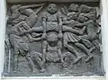 Below the statute is a modern Egyptian-style portico in Portland stone with four giant order square columns rising three floors, framing three entrance doors. Above each door is a ciment fondu relief panel also by Epstein, installed in 1955, representing the new generation who will benefit from the rebuilding: one of children fighting, another of a baby in a pram beside a dog, and the third depicting children playing. The children are modelled on Epstein's children and grandchildren.