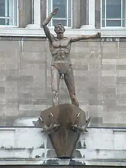 The main 18-foot-high (5.5 m) bronze statue stands on the portico above the entrance. It depicts a naked man standing on a plinth shaped like the prow of a ship projecting from the façade of the building, with left arm stretched out and right arm raised as if calling or signalling. It symbolises Liverpool's resurgence following the war, but it is nicknamed locally as either "Nobby Lewis" or "Dickie Lewis".