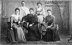 ![]() "Defenders of Free Speech", a postcard published by the Victorian Socialist Party celebrating the Prahran Free Speech Fight. From left: Ahern, Tom Marn, Mrs Edwards, Mrs Anderson. | |