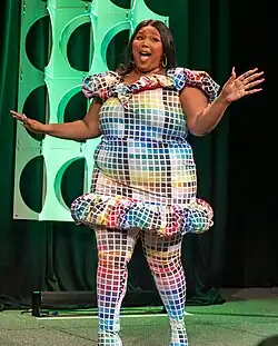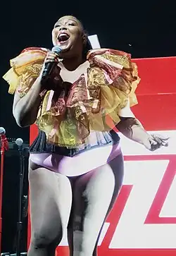 After struggling with body issues at an early age, Lizzo became an advocate for body positivity and self-love as she attracted more mainstream attention,[8] while making diversity the focus of her music, in regards to one's body, sexuality, race, and more.[8] Her group of back-up dancers, the Big Grrrls, consists of all plus-size dancers.[54] Highlighting body inclusivity and celebrating individuality, Lizzo appeared in ModCloth's "Say It Louder" campaign, which launched on June 11, 2018.[55][56] In the same month, she sported the first plus-size outfit made for FIT's Future of Fashion runway show by Grace Insogna for her performance at NYC Pride's Pride Island event.[57] Lizzo was profiled in the June 2018 Teen Vogue Music Issue.[58]
