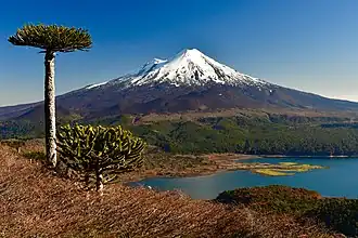 Llaima is one of Chile's most active volcanoes and has frequent but moderate eruptions.[3] Llaima's activity has been documented since the 17th century, and consists of several separate episodes of moderate explosive eruptions with occasional lava flows.[4] A 1640 eruption is thought to have contributed to a pause in the Arauco War between the Spanish and Mapuches established at the Parliament of Quillín in 1641.[5] Possibly Mapuches interpreted the eruption as a signal sent from spirits known as pillanes.[5]
