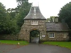 The gardens surrounding the court are a "well preserved early 19th century landscape park".[13] It is possible that the landscape gardeners Samuel Lapidge and John Claudius Loudon were involved in its design.[13] Developments after World War II significantly altered the landscape and many features have been lost, including the kitchen garden dating from the 19th century,[14] and the lake, which is now silted-up.[13] The gardens are listed at Grade II on the Cadw/ICOMOS Register of Parks and Gardens of Special Historic Interest in Wales.[15] The Church of St Mary and St Michael, originally the private chapel for the court, stands in the grounds and has its own Grade II* Listing.[16] The gatehouse to the southwest of the court,[17] and the gates and gate piers to the north have their own Grade II listings.[18]