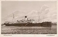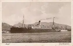 In addition to these nine ships over 3,000 GRT, there were four steamers over 2,000 GRT and 22 steamers of over 1,000 GRT.[1] Among these were the steamers built for the Cia. de Nav. Cruzeiro do Sul, Santos. Hamburg Süd and Hapag had founded this company in 1905 for the coastal service between Rio de Janeiro and Buenos Aires and had five ships (Saturno, Orion, Jupiter and Sirio of 1,800 to 1,900 GRT and for the Rio Grande do Sul–Porto Alegre service Venus of 966 GRT) built in Germany. These ships all entered the service of Lloyd Brasileiro between 1908 and 1916 after the German holdings were abandoned.[5]
