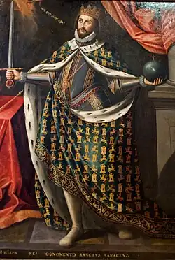 The sword Lobera (Spanish: la espada lobera, literally: "the wolf-slaying sword") was the symbol of power used by Saint Ferdinand III of Castile, instead of the more traditional rod, and so the king will be depicted with orb and sword in hand.