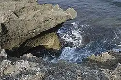 The cave is limestone and coral, surrounded by coral reefs, potholes, and gullies.[2] It is accessible at low tide.[1]