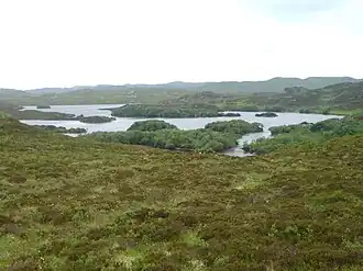 The northeastern part of the loch is a designated Site of Special Scientific Interest (SSSI).[6] The specific area covered are the Downy Birch woodland on eight islands within the loch.[6] The woodland is a prime example of the type that would have covered the area extensively in the past.[6] The area of the site SSSI overlaps with the areas general Assynt Lochs SSSI,[7] that is notable for its population of black-throated divers where the loch is one of the nesting sites for this species.[6] The Loch is also a nesting site for common gull, European golden plover, meadow pipit, red grouse, skylark, barn swallow and wheatear.[2] The water-lily Nuphar pumila grows around the loch.[2]