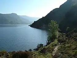 Loch Morar (Scottish Gaelic: Loch Mòrair) is a freshwater loch in the Rough Bounds of Lochaber, Highland, Scotland.[2] It is the fifth-largest loch by surface area in Scotland, at 26.7 km2 (10.3 sq mi), and the deepest freshwater body in the British Isles with a maximum depth of 310 m (1,017 ft). The loch was created by glacial action around 10,000 years ago, and has a surface elevation of 9 metres (30 ft) above sea level. It separates the traditional district of North Morar (which contains the village of Morar), from Arisaig and Moidart.