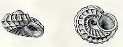 The height of the shell attains 2.25 mm. This is a small, solid, white shell with a deep umbilicus, elegantly sculptured. It contains 4 whorls, with two apical sleek, white whorls. The two others are aequicostate with smooth, thickened, subflexuous ribs. The penultimate whorl is very flat. The last whorl has four spiral keels, with a blunt keel below the sutures, two at the periphery. The aperture is round.[2]