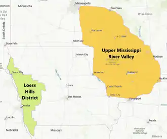 Loess Hills District is an American Viticultural Area (AVA) located in western Iowa and northwestern Missouri established on March 3, 2016 by the Alcohol and Tobacco Tax and Trade Bureau (TTB), Treasury after reviewing the petition submitted by Shirley Frederiksen, on behalf of the Western Iowa Grape Growers Association and the Golden Hills Resource Conservation and Development organization proposing the establishment of the “Loess Hills District.”[4] The district is a long, narrow north–south orientated swath of land along the Big Sioux and Missouri Rivers, covering 12,897 square miles (8,254,080 acres) from Hawarden, Iowa, to Craig, Missouri. There are approximately 66 commercially-producing vineyards covering a total of 112 acres (45 ha) distributed throughout the AVA, along with 13 wineries.[1] Loess Hills District is not a sub-region within any established AVA.[3]