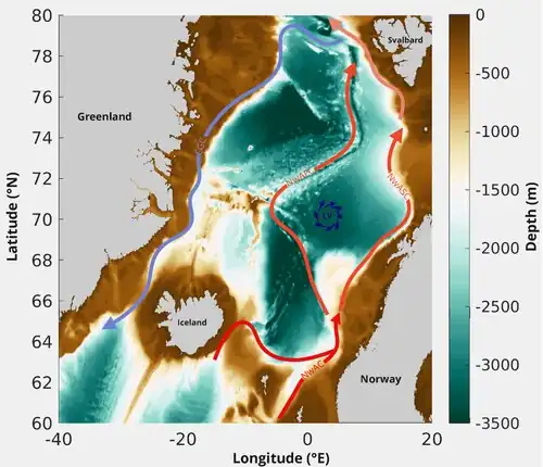 The Norwegian Atlantic Current (NwAC) is considered the northern branch of the Atlantic Meridional Overturning Circulation (AMOC). Its two limbs, the NwASC and the NwAFC,[15] carry warm and saline Atlantic Water (AW) poleward to the Arctic Ocean.