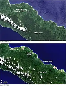 Deforestation in Papua New Guinea is mainly a result of illegal logging, which contributed to 70-90% of all timber exports, one of the highest rates in the world.[3] Illegal logging is linked to corruption, environmental issues and human rights concerns.[4]