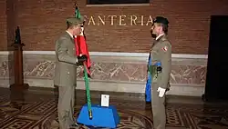 On 1 February 2002, the battalion was disbanded and the next day its flag was transferred to the Shrine of the Flags in the Vittoriano in Rome for safekeeping. In November 2015 the commander of the Logistic Regiment "Aosta" arrived in Rome to retrieve the flag and transfer it to Palermo, where it arrived at the regiment's base on 20 November 2015.[1][8]