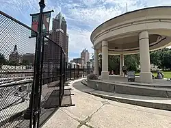The Republican Party objected to the prospect of Père Marquette Park being utilized as a site for public demonstration (protest), arguing that it was too near to convention activities and therefore posed a security risk.[110] Ultimately, a committee of sixteen organizations agreed that the park was too close to the Milwaukee County Historical Society building, which was to be utilized for official convention events.[111] The convention organizers only booked the building for use several weeks prior to the convention itself, and their objection to protesters using the park had preceded this booking.[112] The park was made inaccessible to the public during the convention,[111] a decision that has generated controversy.[113][114]