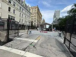 The security perimeters of the convention were twofold: there was a central "hard" security perimeters in which only credentialed individuals were permitted, and an outer security perimeters in which credentials were not required, but for which vehicles were screened at security checkpoints prior to entry. Two sets of separate security perimeters were established for the convention: a main one surrounding the convention's main venues, that was scheduled to be "hardened" (begin to enter effect) on July 14; and a second one securing the Henry Maier Festival Park on July 14.[93] The close proximity of the main venue and several secondary venues used for the convention allowed them all to be contained in a single "hard" security zone.[94] The vehicle screening perimeter of the security zone surrounding the main venues of the convention measured ten city blocks by six city blocks.[83] The Milwaukee Common Council approved the restriction of many items from the convention's security footprint.[95]