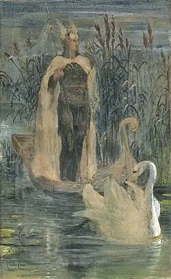 Lohengrin first appears as "Loherangrin", the son of Parzival[1] and Condwiramurs in Wolfram von Eschenbach's Parzival.[2] Wolfram's story is a variation of the Knight of the Swan tale, previously attached to the Crusade cycle of medieval literature. Loherangrin and his twin brother Kardeiz join their parents in Munsalväsche when Parzival becomes the Grail King; Kardeiz later inherits their father's secular lands, and Loherangrin remains in Munsalväsche as a Grail Knight. Members of this order are sent out in secret to provide lords to kingdoms that have lost their protectors and Loherangrin is eventually called to this duty in Brabant, where the duke has died without a male heir. His daughter Elsa fears the kingdom will be lost, but Loherangrin arrives in a boat pulled by a swan and offers to defend her, though he warns her she must never ask his name. He weds the duchess and serves Brabant for years, but one day Elsa asks the forbidden question. He explains his origin and steps back onto his swan boat, never to return.