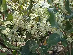 Hybrids have been recorded with the river lomatia (Lomatia myricoides) on the Southern Tablelands, resulting in plants resembling L. fraseri but less hairy, and with crinkle bush (L. silaifolia) in the New England area, resulting in plants with highly variable leaf shapes and hairy leaf undersides. Hybrids with native holly (L. ilicifolia) have been recorded, the resulting plants having variable hairiness and prickliness.[1] Analysis of chloroplast DNA showed that there is extensive hybridization between the five species (L. arborescens, L. fraseri, L. ilicifolia, L. myricoides and L. silaifolia) of mainland southeastern Australia, though each is distinct enough to warrant species status.[6]