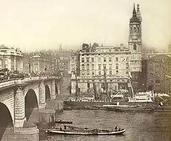 London Bridge Wharf was a wharf in the City of London located alongside London Bridge, just to the east of the north end of the bridge. It stood below the Adelaide Buildings and their 1925 replacement, Adelaide House. The wharf was constructed on the site of the London Bridge Waterworks, which had been demolished along with Old London Bridge in 1832. It originally handled general cargo[1] and also passenger steamships, such as the vessels of the New Medway Steam Packet Company, which offered daily "sea cruises" along the North Kent and Essex coasts.[2]