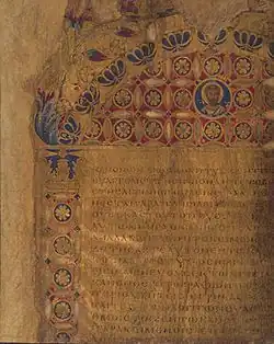 The London Canon Tables (British Library, Add MS 5111) is a Byzantine illuminated Gospel Book fragment on vellum from the sixth or seventh century. It was possibly made in Constantinople. The fragment consists of two folios of two illuminated canon tables – of unusual construction – set beneath an ornamental arcade and the Letter by Eusebius of Caesarea which usually prefaces canon tables. The fragment is bound together with a twelfth-century Gospel Book (British Library, Add. MS 5111 and 5112) which is thought to have belonged to one of the monasteries on Mount Athos.