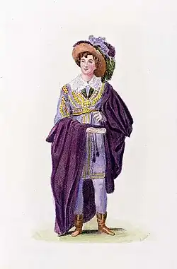 The theatre finally became a licensed house in 1809, and until 1812 it was used for dramatic performances by the Drury Lane Company after the burning of their own theatre, until the erection of the new edifice. It staged one of the earliest tableaux vivants, as part of William Dimond's The Peasant Boy in 1811.[5] In 1816, Samuel Arnold rebuilt the house to a design by Beazley and opened it as The English Opera House, but it was destroyed by fire in 1830. The house was famous for hosting the London première of Mozart's opera Così fan tutte (9 May 1811)[6] and as the first theatre in Britain to have its stage lit by gas (6 August 1817).[7] During this period, the "Sublime Society of Beef Steaks",[8] which had been founded in 1735 by theatre manager Henry Rich, had its home at the theatre for over 50 years until 1867. The members, who never exceeded twenty-four in number, met every Saturday night to eat beefsteaks and drink port wine.[9]