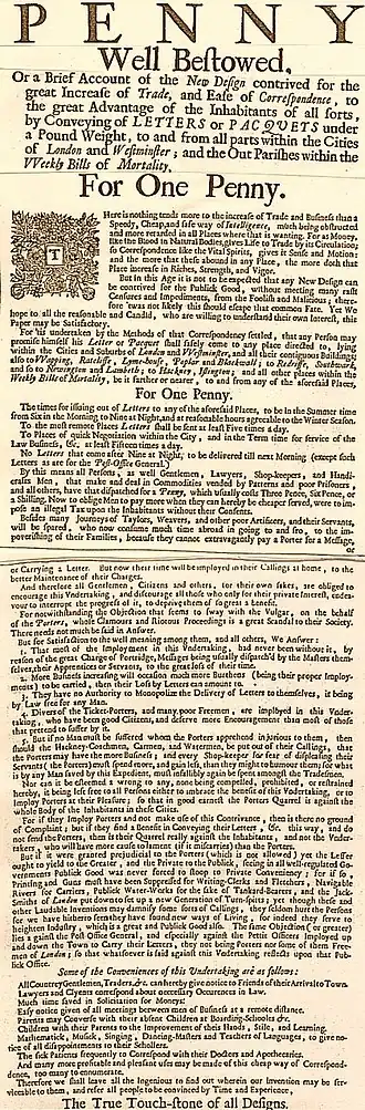 With its cheap flat postage-rate of one penny, the London Penny Post quickly became a commercial success; however it compromised the business interests of the capital's porters and private couriers. It also threatened the interests of the Duke of York, who at that time profited directly from the General Post Office (which had been established by royal decree, some decades earlier, as a nationwide monopoly); this ultimately led to the takeover of the Penny Post by crown authorities in 1682.[2][3]