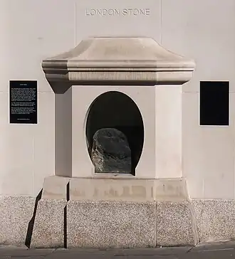 - ^ a b Historic England. "'London Stone' with stone surround and iron grille set into base of number 111 Cannon Street EC4 (Grade II*) (1286846)". National Heritage List for England. Retrieved 11 November 2018.