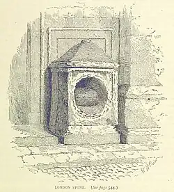 In 1598 the London historian John Stow admitted that "The cause why this stone was set there, the time when, or other memory hereof, is none".[6] However, his contemporary William Camden, in his Britannia of 1586, concluded that it was a Roman milliarium, a central stone from which all distances in Roman Britain were measured, and similar to the Milliarium Aureum of Rome.[31] This identification remains popular, although there is no archaeological evidence to support it.[32]