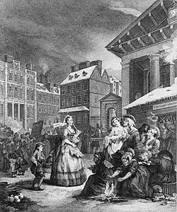 Various coffeehouses catered to diverse groups of individuals who focused on specific topics of discussion.[38] The variety of topics and groups to which the coffeehouses catered to offers insight into the non-homogeneous nature of English society during the period in which coffeehouses rose to their peak in popularity. These different coffeehouse characters are evident when evaluating specific coffeehouses in detail during the period. After the Restoration, coffeehouses known as penny universities catered to a range of gentlemanly arts and acted as an alternate centre of academic learning.[46] These included lessons in French, Italian or Latin, dancing, fencing, poetry, mathematics and astronomy.[46] Other coffeehouses acted as a centre for social gathering for less learned men. Helen Berry evaluates one coffeehouse, known as Moll King's coffeehouse, which is depicted to be frequented by lowlifes and drunkards as well as "an unusual wide social mix of male customers, from courtiers to Covent Garden market traders and pimps."[47] It was also frequently associated with prostitution. Customers also habitually engaged in a type of conversation known as "flash", a derivative of criminal speak.[48] Moll King's coffeehouse was used as a case study for Berry to prove that polite conversation was not always used within a coffeehouse setting.[44] Other groups frequented other coffeehouses for various reasons. For example, Child's coffeehouse, "near the Physician's Warwick Lane and St. Paul's church yard", was frequented by the clergy and by doctors."[49]