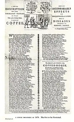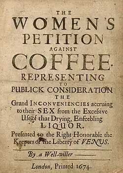 Historians disagree on the role and participation of women within the English coffeehouse. Bramah states that women were forbidden from partaking in coffeehouse activity as customers.[73] Cowan, on the other hand, explains that while coffeehouses were free and open to all subjects despite class, gender, or merit, conversation revolved around male-centred issues such as politics, business and cultural criticism, which were not supposed to concern women and thus their participation within coffeehouses was unwelcomed.[74] Historians depict coffeehouses as a gentlemanly sphere where men could partake in conversation without associating with women;[73] coffeehouses were consequently not considered a place for a lady who wished to preserve her respectability.[75] As such, complaints against the coffeehouse were commonly vocalised by women.[76] Women used subtle arguments against coffeehouse frequenting, as well as coffee consumption, outlined in "The Women's Petition Against Coffee."[76] They protested against the consumption of coffee arguing that it made men sterile and impotent and stated that it contributed to the nation's failing birth rate. According to the petition, coffee made men "as unfruitful as the sandy deserts, from where that unhappy berry is said to be brought."[76] Women also raised protest against the coffeehouse itself as it "provided in times of domestic crisis when a husband should have been attending to his duties at home."[76]