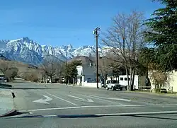 Lone Pine is a census-designated place (CDP) in Inyo County, California, United States,[2] located 16 mi (26 km) south-southeast of Independence.[4] The population was 2,014 at the 2020 census, down from 2,035 at the 2010 census. The town is located in the Owens Valley, near the Alabama Hills and Mount Whitney, between the eastern peaks of the Sierra Nevada to the west and the Inyo Mountains to the east. The local hospital, Southern Inyo Hospital, offers standby emergency services.[5] The town is named after a solitary pine tree that once existed at the mouth of Lone Pine Canyon.[6] On March 26, 1872, the very large Lone Pine earthquake destroyed most of the town and killed 27 of its 250 to 300 residents.
