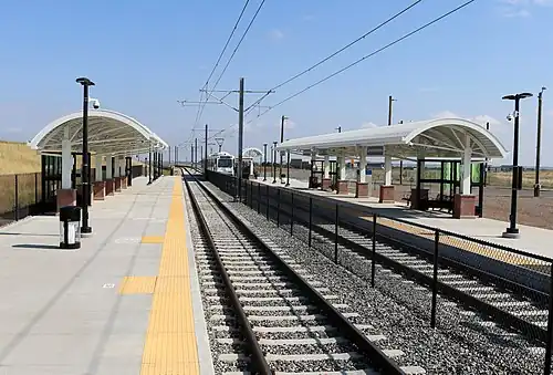 Lone Tree City Center station is a light rail station in Lone Tree, Colorado, part of the Regional Transportation District (RTD) system in the Denver metropolitan area. It is served by the E Line to Union Station.[3] It was also formerly served by the R Line to Aurora, but the R Line currently terminates at Lincoln station due to low ridership in this area of Lone Tree which is still under construction and amid generally lower ridership due to the impact of the COVID-19 pandemic on public transport.