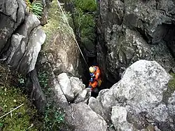 ![]() A caver descending the entrance pitch of Rift Pot | |