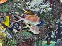 Vocalization has been described in 30 families of fishes. Aggressive sounds tend to be middle-frequency (about one kHz). Distressed sounds can be a bit higher frequency (about 6 kHz).[6] Longspine squirrelfish make two kinds of sounds, a single "grunt" and a short burst of sounds called a "staccato." The grunt sounds are used mostly to defend their territory. The staccato sound indicates alarm. Other longspine squirrelfish hearing the staccato sound will first retreat into their crevices, then come out to investigate the threat. Sometimes several of them make staccato sounds to scare away predators like the moray eel. This behavior is called "mobbing."[7] Researchers have observed that the longspine squirrelfish makes sounds more frequently at dusk.