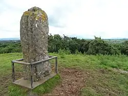 The longstone, a lump of limestone about 2.3 m (7 ft 7 in) in height, is located on a mound within a bivallate ringfort.[1] The site was excavated in 1973–76 by P. Danaher,[2] where 4,000 potsherds, 6 complete vessels, over 400 flint scrapers, cremated bones and grooved ware pottery were found. The mound is thought to date from c. AD 1 (mid-Iron Age), with the rath being added about AD 600.[3][4][5] According to Prof. Peter Danaher, Carrowkeel-style bowls from the complex site at Longstone seem to indicate a transitory camp of passage-tomb folk, and the hilltop was also used by Beaker, Food Vessel and Urn peoples, indicating that the site was a "halting site" for many thousands of years before the longstone and rath were made.[6] Nearby is Cullen Bog in which votive offerings were placed including many gold and bronze artefacts.[7]