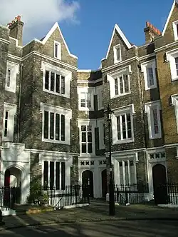 The Tudor features, especially the high gables resembling Tudor rooftops, may have been inspired by the site's almshouse connection.[14] [4]: 118 On the east and west sides the front doors have triple quatrefoils for fanlights, and on the north and south sides, blind multi-foil sunk panels. At the angles, the doors are oddly grouped in threes, with the centre house extending outwards at the back. The south-west corner only had a facade until the mid 1960s, when the space behind the facade was infilled by an ingeniously contrived building providing two maisonettes and a flat by Peter Foggo, one of the founders of Arup Associates.[11] It was later converted into a single family house.