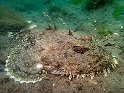 The pectoral and pelvic fins are articulated as to perform the functions of feet, so the fish is able to walk along the bottom of the sea, where it generally hides in the sand or amongst seaweed. Around its head and also along the body, the skin bears fringed appendages resembling short fronds of seaweed, a structure which, combined with the ability to match the colour of the body to its surroundings, assists this fish in camouflaging itself in the places which it selects on account of the abundance of prey. It has no scales.[13]