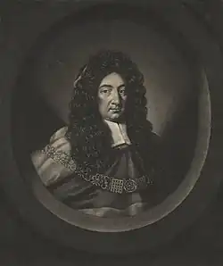 Scroggs was the son of an Oxford landowner; the story of him being the son of a butcher of sufficient means to give his son a university education is merely a rumour, although one which was widely believed.[1] He spent his youth in Stifford.[2] He went to Oriel College, and later to Pembroke College, Oxford, where he graduated in 1640, having acquired a fair knowledge of the classics. There is some evidence that he fought on the royalist side during the Civil War; certainly, his loyalty to the Crown was never doubted in later years. In 1653 he was called to the bar, and soon gained good practice in the courts.[3]
