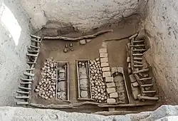 Buried with the Lord of Sipán were six other people: three young women (possibly wives or concubines who had apparently died some time earlier), two males (probably warriors), and a child of about nine or ten. The remains of a third male (possibly also a warrior) was found on the roof of the burial chamber sitting in a niche overlooking the chamber. There was also a dog. The warriors who were buried with the Lord of Sipán had amputated feet, as if to prevent them from leaving the tomb. The women were dressed in ceremonial clothes. In addition to the people, archeologists found in the tomb a total of 451 ceremonial items and offerings (burial goods), and the remains of several animals, including a dog and two llamas.[2]